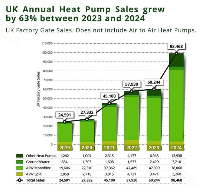 Sales of heat pumps in the UK have reached record levels in 2024, with factory gate data from the Heat Pump Association (HPA) showing a 63% increase compared to 2023. A total of 98,468 heat pumps were sold, marking a significant step towards decarbonising home heating.