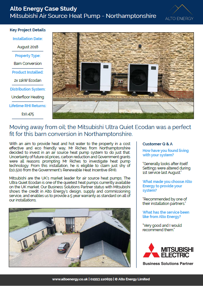 Mitsubishi are the UK’s market leader for air source heat pumps. The Ultra Quiet Ecodan is one of the quietest heat pumps currently available on the UK market. Our Business Solutions Partner status with Mitsubishi shows the credit in Alto Energy’s design, supply and commissioning service, and enables us to provide a 5 year warranty as standard on all of our installations.